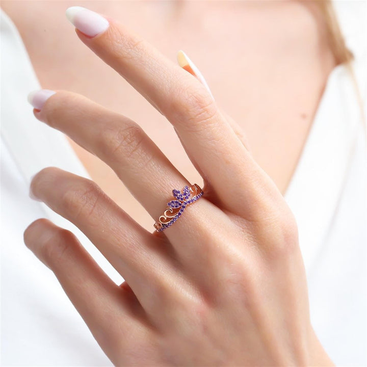 Amethyst Crownlet is a petite crown-inspired ring set with vibrant purple gemstones across a sculpted coronet band. Crafted in 92.5 sterling silver with warm rose-gold plating, the piece balances playful royalty with everyday elegance, designed to sit comfortably while offering a subtle, jewel-toned statement.