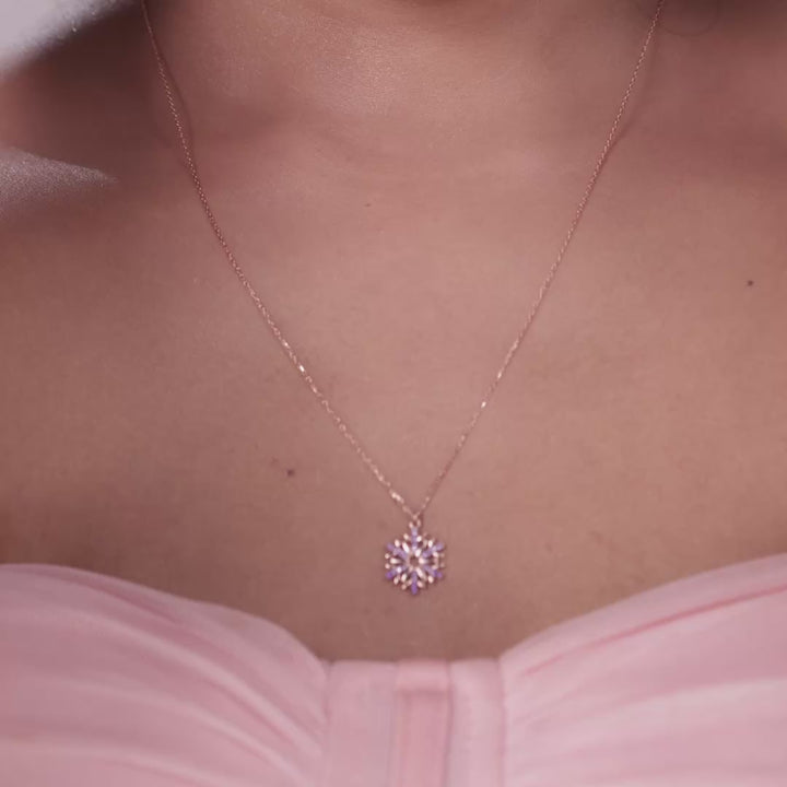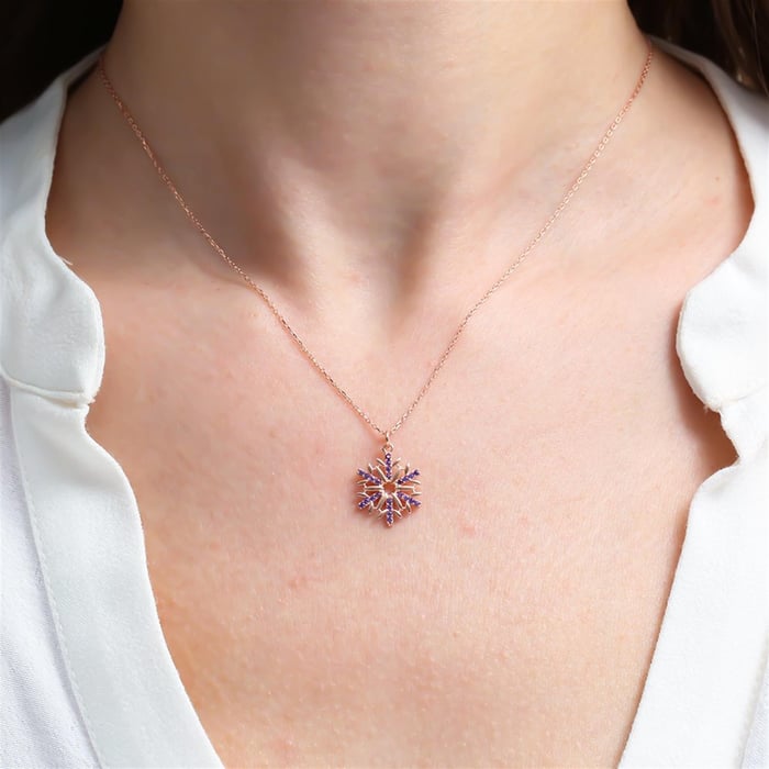 Inspired by shooting stars, a radiant burst of rose-gold spokes centres on violet zirconia crystals that glitter like twilight skies. Every ray is hand-soldered from hallmarked 925 Sterling Silver, then sealed under a durable rhodium coat so the colours stay vivid through years of wears. Lightweight yet full of drama, it turns simple knits or deep necklines into instant conversation starters—perfect for everyday glow or after-dark sparkle.