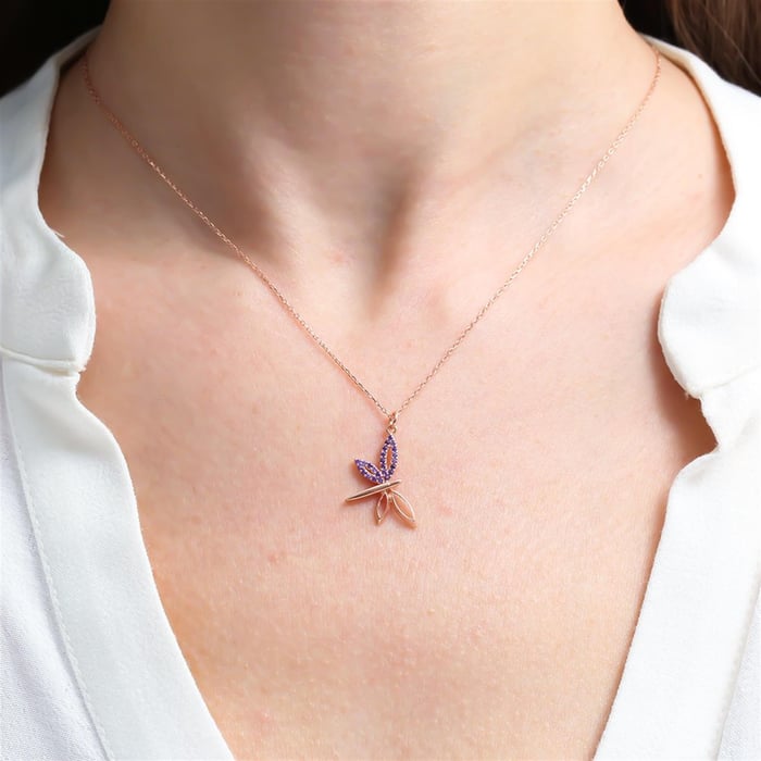 A dragonfly takes wing with two amethyst-hued zirconia wings and two sleek rose-gold wings, symbolising freedom, change, and a touch of whimsy. The body and chain are forged from hallmarked 925 Sterling Silver and coated in nickel-free rhodium, so the metal stays bright and skin-friendly. Delicate, airy, and artisan-made, it’s the ideal accent for everyday jeans-and-tee days or as a subtle pop of colour at evening events.
