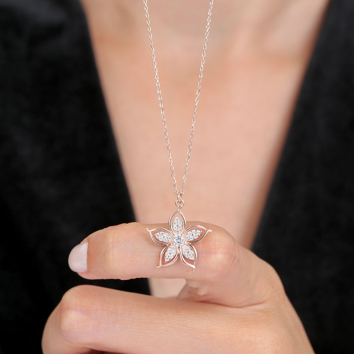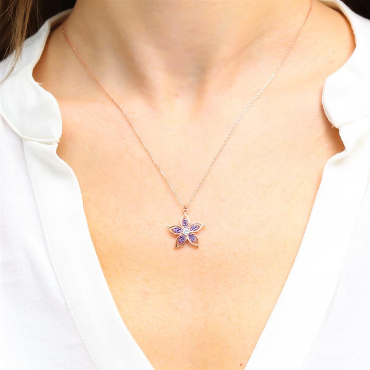 Five sculpted petals shimmer with lavender-hued stones around a brilliant-cut centre, capturing the delicacy of a spring bloom that never fades. Crafted in hallmarked 925 Sterling Silver, each petal edge is polished by hand before receiving a protective rhodium finish that keeps the colours radiant. Perfect for both everyday layering and dress-up moments when you want a soft pop of colour.