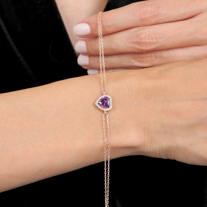 Amethyst Heartlet captures a quiet, romantic moment in metal and stone. A faceted heart-shaped amethyst sits at the center, haloed by pavé-set clear stones and suspended on a fine, adjustable 92.5 sterling silver chain plated in warm gold. Designed to be worn close to the skin, this bracelet reads as both intimate and refined, lending a soft purple glow that flatters day and evening looks.