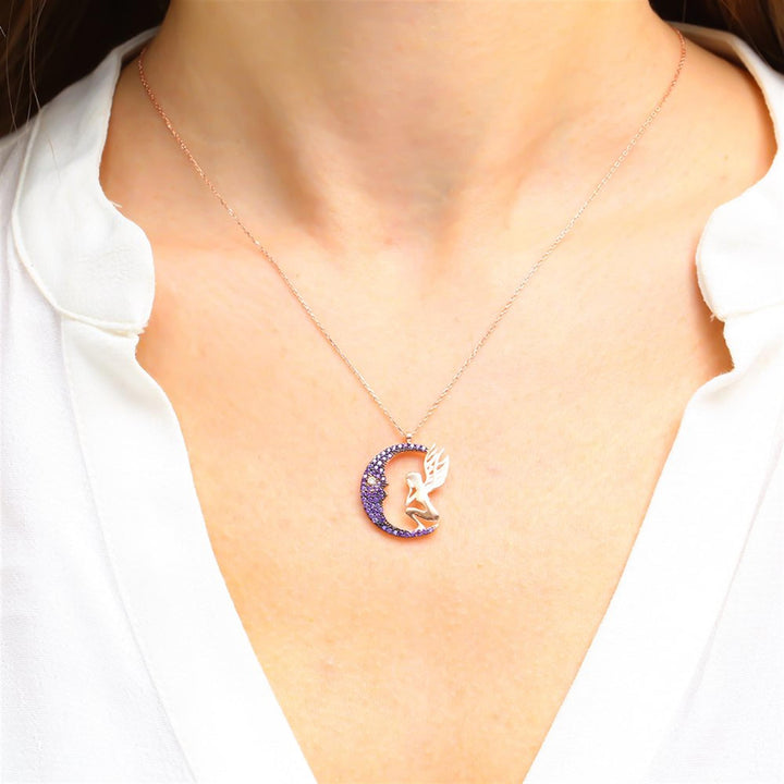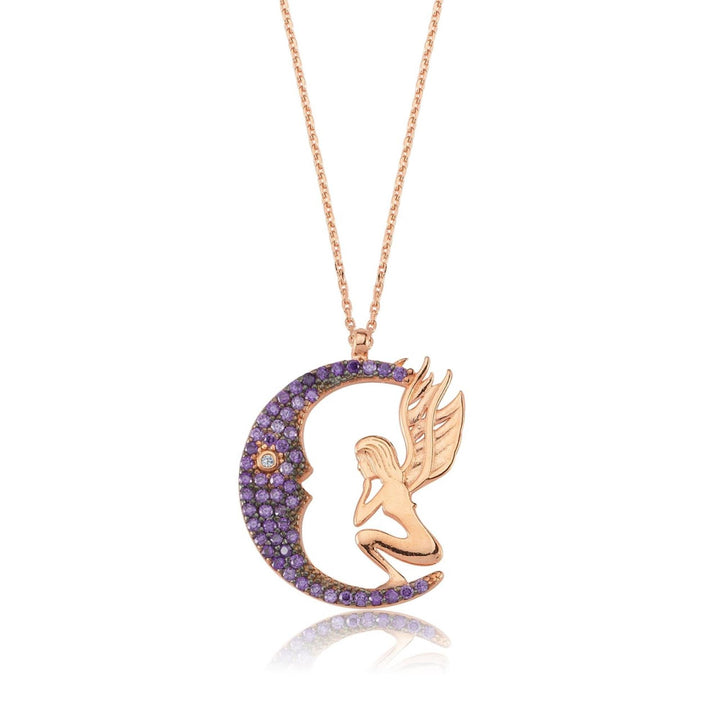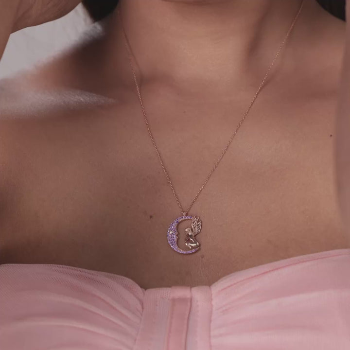 A dream-filled crescent moon, paved with midnight-violet stones, cradles a delicate fairy in rose-tinted silver—capturing the wonder of starlit skies. Moulded from solid 925 Sterling Silver and sealed with a hypoallergenic rhodium coat, this artisan pendant resists dulling so your celestial companion can sparkle night after night. Ideal for everyday whimsy or as a standout piece for special occasions.