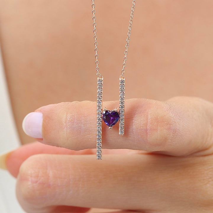 Two slim pavé bars frame a violet heart stone, mixing straight-line minimalism with a soft touch of colour. The bar design sits close to the neck, layers well with longer chains, and stays put even on busy days. An easy go-to when you want effortless shine with a hint of romance.