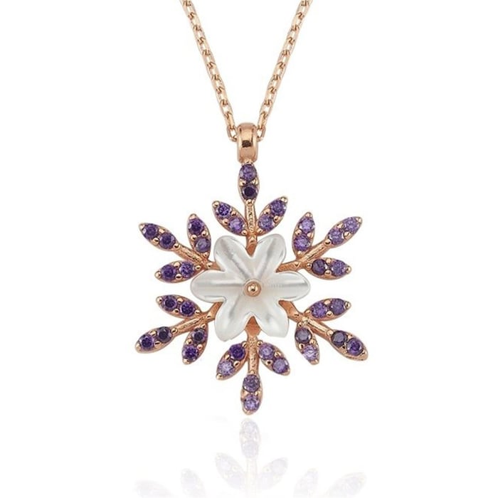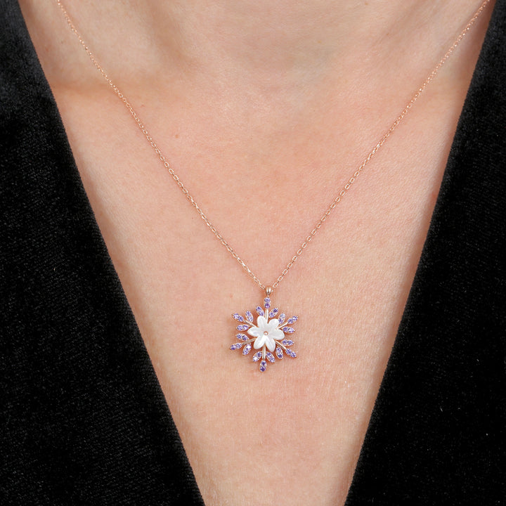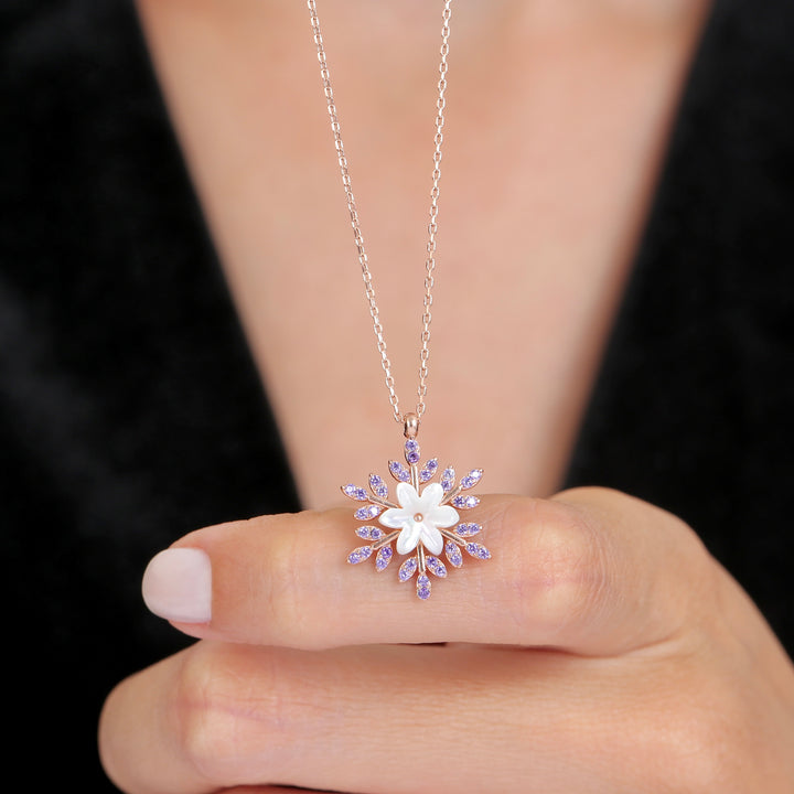Violet stones sit on each “ice crystal” arm, circling a white mother-of-pearl flower for a winter-meets-spring feel. The pendant catches light from every angle yet stays light enough for everyday wear. Ideal for adding gentle colour to simple outfits.