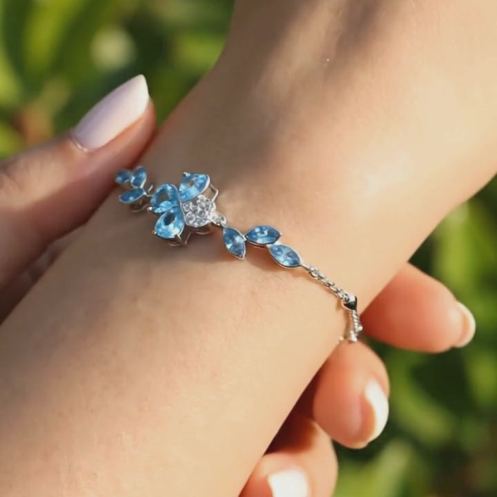 Sky-blue stones form a tiny butterfly around a clear crystal heart, linked by small leaf-shaped charms. The slim chain keeps the look light, so you can wear it from jeans to summer dresses without bulk. Slide clasp lets you tighten or loosen in seconds—easy for stacking or wearing solo.