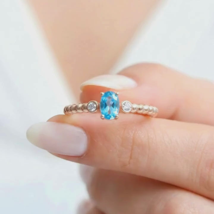 Azure Locket centers an oval ocean-blue gem flanked by two bright white accents, set on a finely beaded rose-gold band. The textured band and open, airy setting give the ring a vintage-touched clarity while keeping it modern and wearable. Designed to feel light on the finger, Azure Locket reads as a quiet heirloom for everyday elegance and meaningful moments.