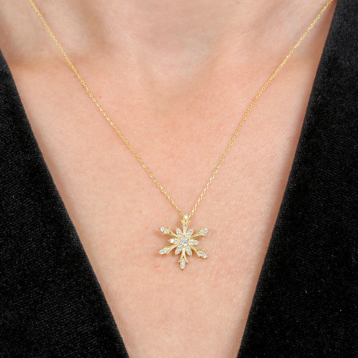 A luminous symbol of winter’s quiet brilliance, the INAARA Celestial Bloom Pendant combines vintage romance with modern refinement. At its centre sits a brilliant round stone, surrounded by a symmetrical snowflake starburst of marquise and round accents that catch the light from every angle.