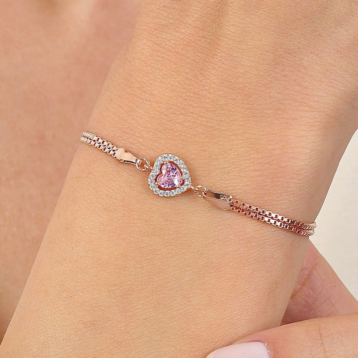 A soft pink heart stone sits inside a crystal‐lined halo and is linked to a sleek double chain, giving your wrist a gentle hint of colour without bulk. Tiny polished heart links on each side keep the design playful yet refined. Adjustable slider clasp lets you tighten or loosen in seconds, so it’s as easy for everyday coffee runs as it is for date night.