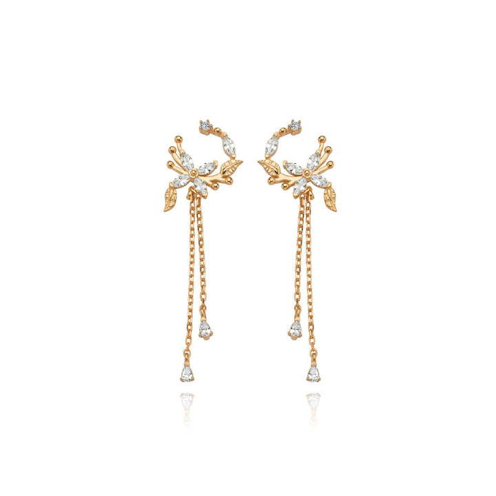 Open circle studs burst into leaf-shaped crystals and bead-like buds, finished with twin chain drops that sparkle as you move. The warm rose gold plating makes them dressy enough for weddings yet light enough for long wear. Pair with pulled-back hair to let the swingy drops shine.