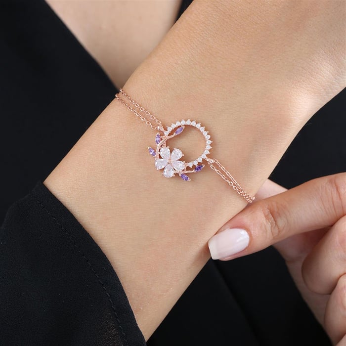 Floral-crown design, bathed in warm rose-gold for a softer, romantic vibe. Lilac zircons and a luminous white flower stand out beautifully against neutral or pastel outfits. Feather-light and adjustable, it’s an easy grab-and-go piece that looks thoughtfully styled every time.