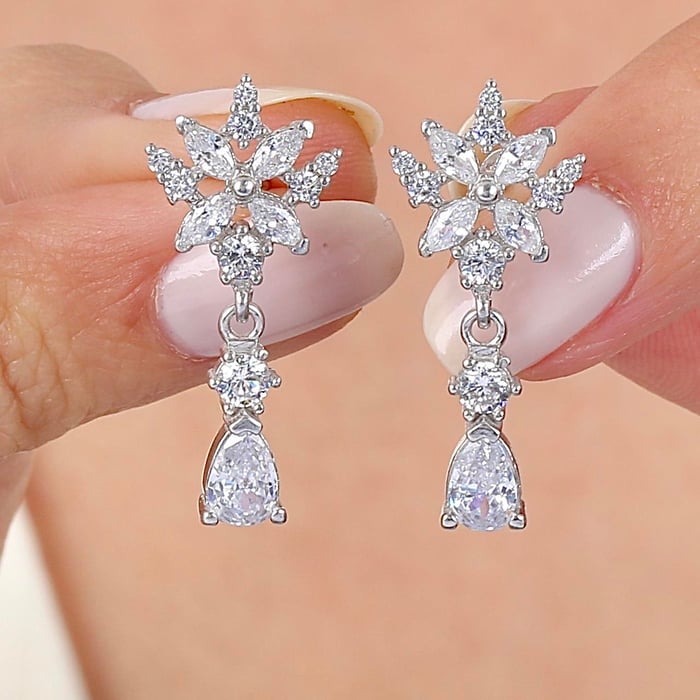 A dainty marquise “sun” explodes in sparkle, flowing into a single pear-cut teardrop that moves with every turn of your head. Light yet luminous, they frame the face beautifully and dress up everything from office blacks to bridal pastels.