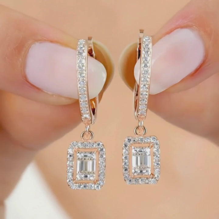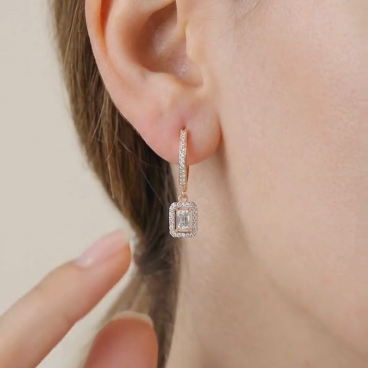 A clear emerald-cut stone sits inside a micro-halo and swings from a pavé-lined huggie, giving neat, red-carpet sparkle without bulk. Lightweight yet glamorous, they transition effortlessly from office dinners to wedding receptions.