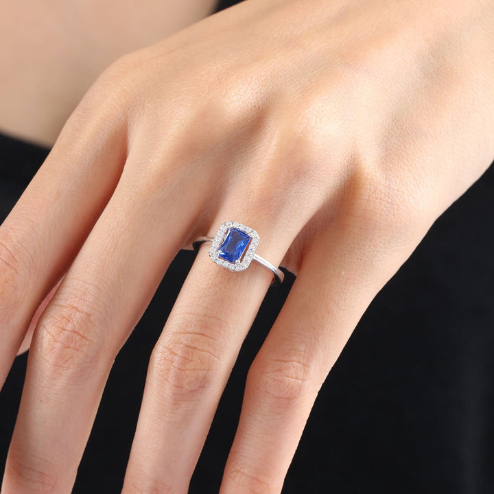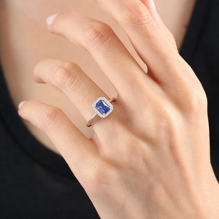 A rich sapphire-blue baguette sits centre-stage inside a micro-pavé halo, all on a slim comfort-fit band that stacks easily with wedding sets or plain bands. The clean, raised setting lets light in from every angle, so the stone glows whether you’re at your desk or out to dinner.