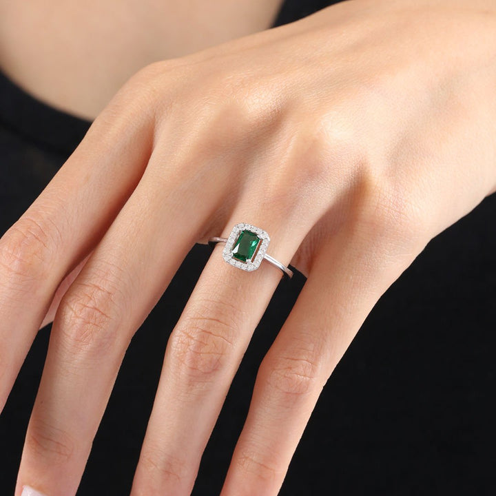 A vivid emerald-green baguette sits in a micro-pavé cushion halo atop a slim comfort-fit band. The raised gallery lets light in from every side, so the stone glows whether you’re typing at work or raising a toast at dinner. A sleek nod to vintage glamour that also stacks beautifully with plain bands.