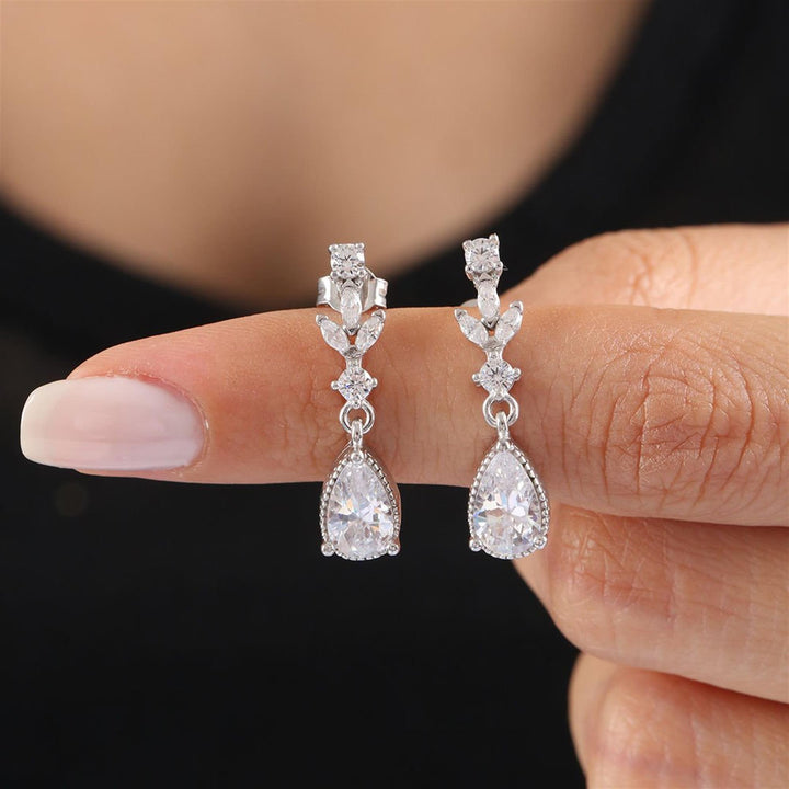 A trio of pavé leaves leads the eye to a pear-cut teardrop framed in micro-halos—delivering plenty of sparkle while staying feather-light on the lobe. The vertical line flatters every face shape and slips easily from office suits to evening gowns.