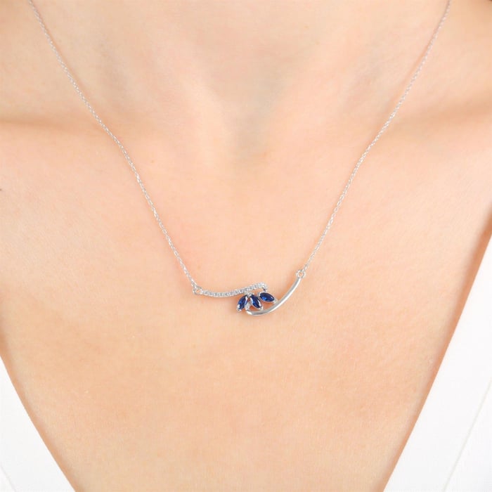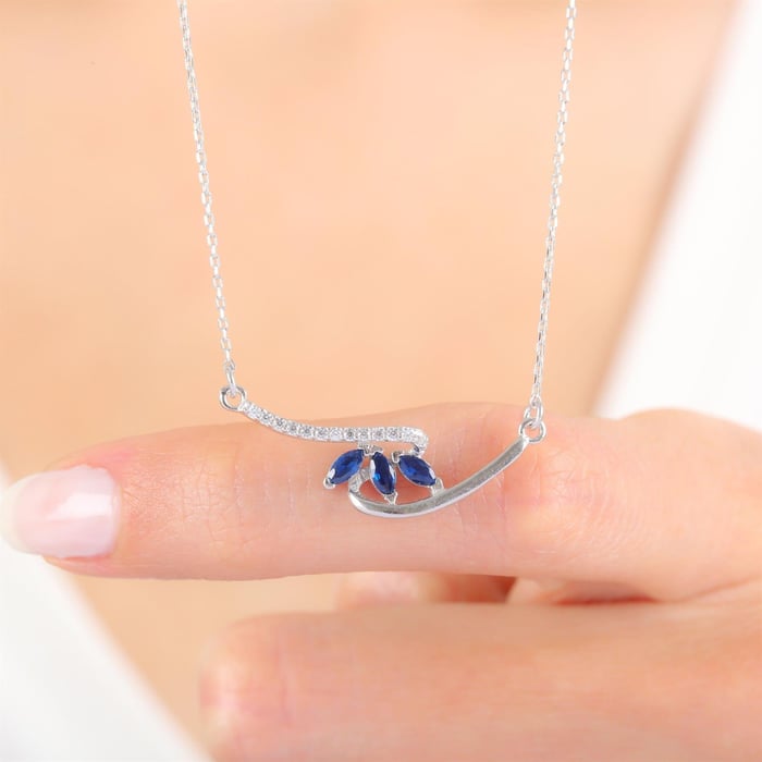 A slim S-curve bar ends in three sapphire marquise “buds” and a line of clear stones above. The low profile hugs the neckline, so it’s comfy under shirts and great for layering. Adds a neat pop of colour without looking dressy—perfect for work-to-weekend outfits.
