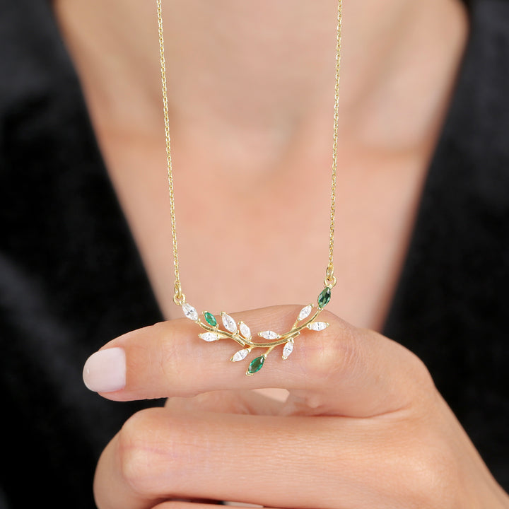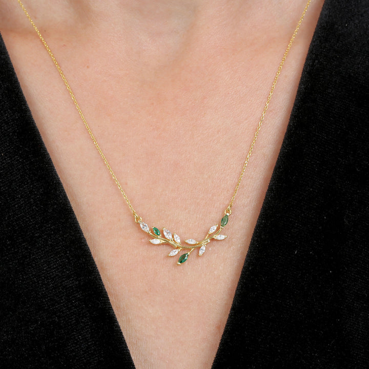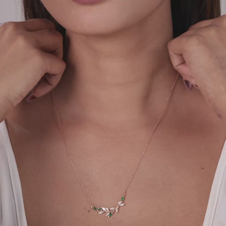 A gentle vine bar dotted with emerald-green and clear marquise “leaves” rests neatly along the collarbone. The slim curve adds a fresh pop of colour without feeling dressy, so you can keep it on from office hours to café catch-ups. Lightweight and easy to layer with longer chains for a fuller look.