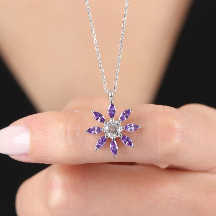 Eight violet marquise stones form a small sun around a clear centre crystal. The pendant hangs just below the neck, giving a neat pop of colour to any top. Simple, bright, and great for everyday wear or as a small gift.