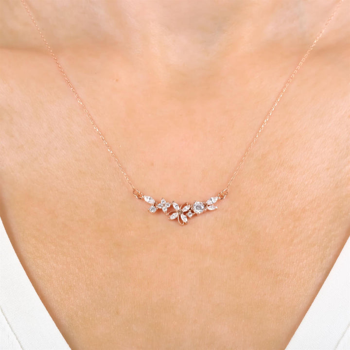 A gentle V-curve of marquise “leaves,” round dew-drop crystals and an openwork flower forms a delicate garden that sits right at the collarbone. The rose-gold finish warms every skin tone, while the low-profile design lets it shine from office hours to evening plans without snagging. Lovely alone, even prettier layered with a slim choker.