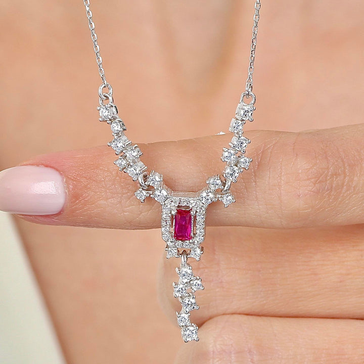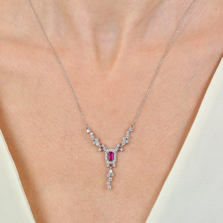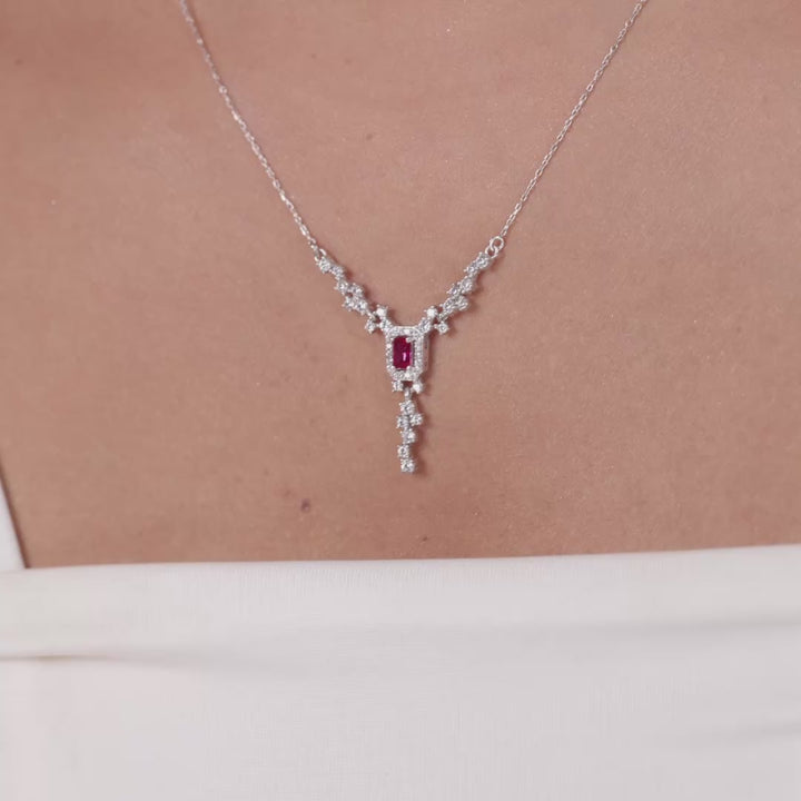 A bright ruby-red stone sits inside a crystal halo, with two glittering “branches” that fall into a slim Y-shape drop. The design fills open necklines and adds a little red-carpet shine without feeling heavy. Perfect for weddings, festive dinners, or anytime you want a pop of rich colour.