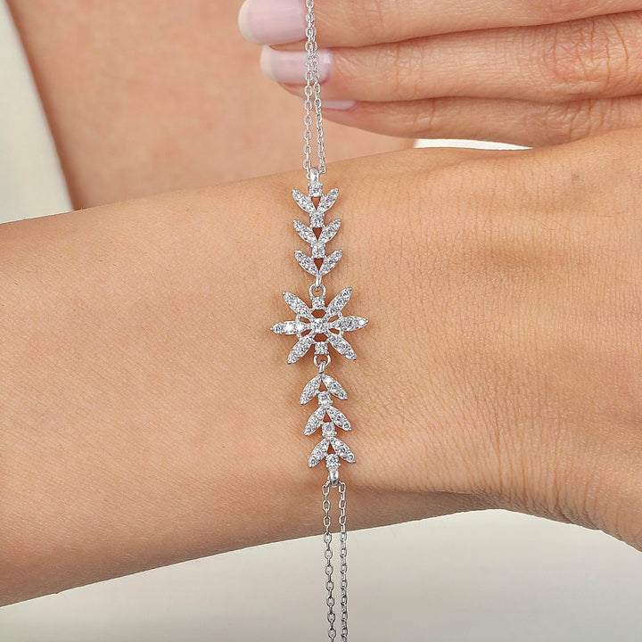 Leaf-shaped links meet in the centre to form a sparkling floral burst, creating the look of a delicate vine wrapped around your wrist. The openwork keeps it feather-light, while the double chain on the back ensures a secure, comfortable fit. Ideal for stacking with a watch or wearing solo for subtle shimmer from desk to dinner.