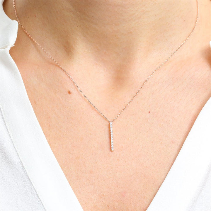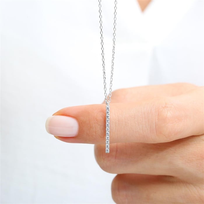 Minimalist lines meet maximum sparkle in this ultra-slender bar, pavé-set with hand-cut zirconia that catch every glimmer of light. Forged in hallmarked 925 Sterling Silver and protected by a rhodium finish, it resists scratches and dullness, staying runway-ready even with daily wear. Adjustable chain lets you choose the perfect drop for office chic or layered evening drama.