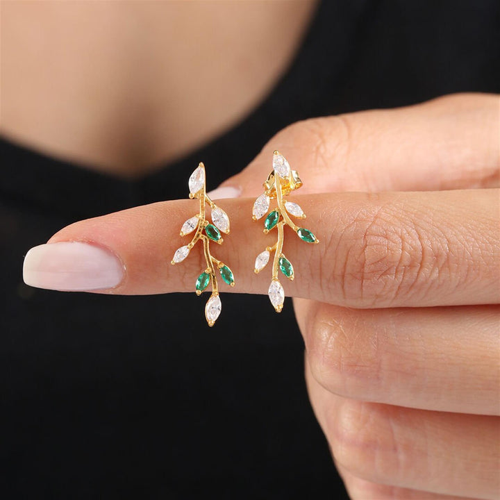 Sleek branch design tipped with alternating emerald-green and clear stones in Gold coated 925 Silver for a fresh pop of colour. Lightweight push-backs keep them comfortably in place from brunch to cocktail hour.