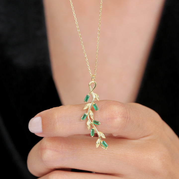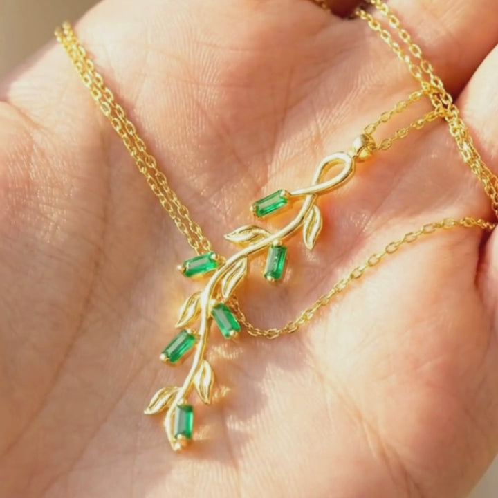 A slender gold branch unfurls into leaf-shaped settings, each kissed with bright green gemstones that catch the light like new foliage. Suspended from a fine gold chain, the piece balances natural lyricism with refined polish, designed to sit at the collarbone and lend a fresh, graceful note to any outfit.