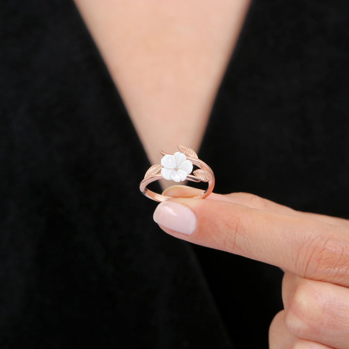 Floral Whisper is a delicate floral ring that pairs a sculpted white blossom with two graceful leaf shoulders, finished in warm rose gold for an intimate, feminine glow. Designed to read like a tiny garden on the hand, the ring balances sculptural detail with lightweight comfort so it wears easily from day to evening.