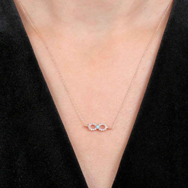 Pendant: A necklace featuring the matching, turquoise-accented infinity pendant, suspended horizontally from a fine, matching chain.