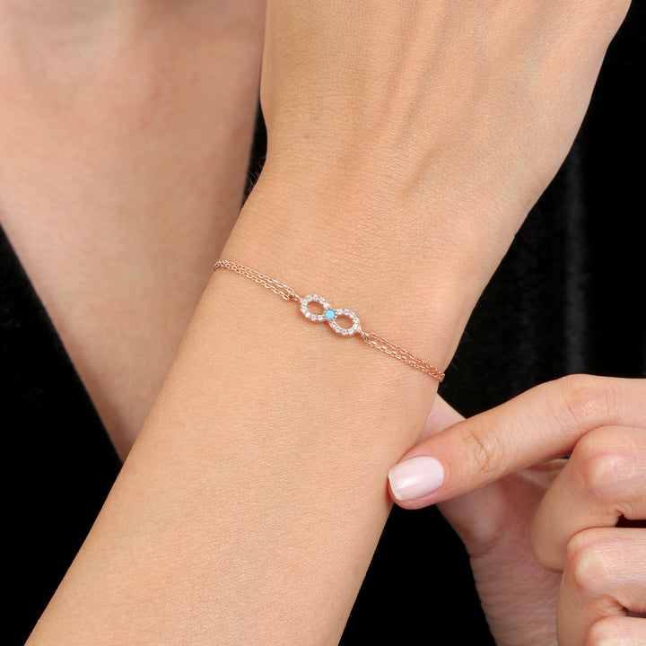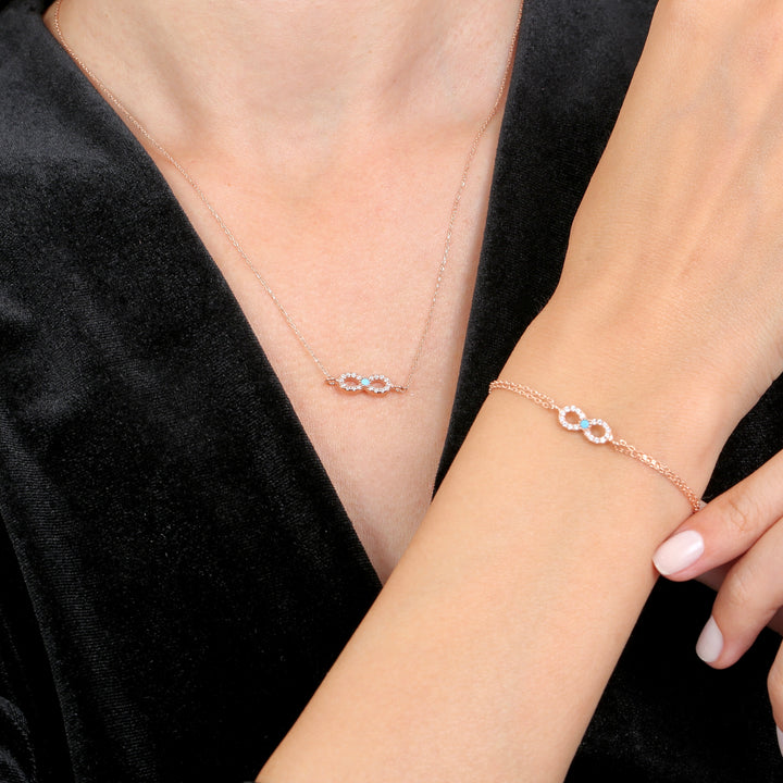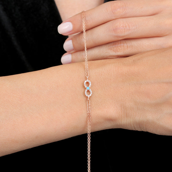 Bracelet: A delicate bracelet featuring the turquoise-accented infinity symbol as a station on a fine, rose gold-plated chain.