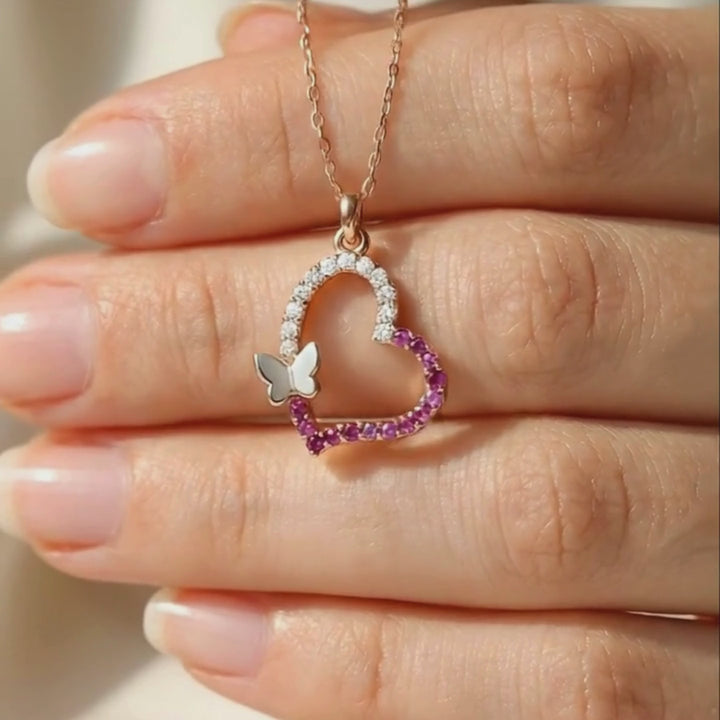 A shimmering fuschia crystal heart pairs beautifully with a dainty white butterfly, capturing the spirit of love and freedom. Set in rose gold, this pendant balances sparkle and softness—perfect for adding a graceful touch to any ensemble.