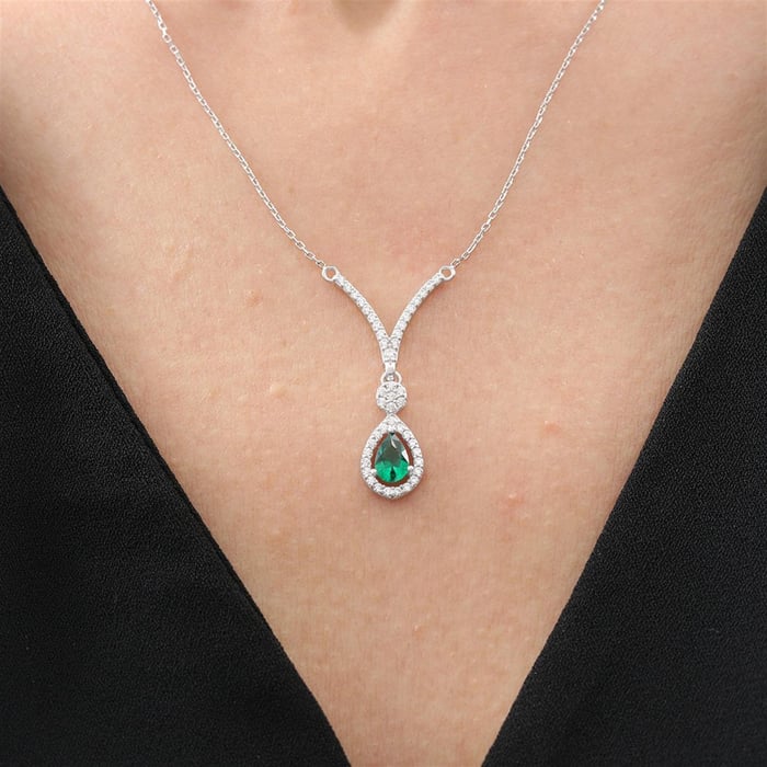 Clear stones form a slim Y-shape that ends in a bright green teardrop, giving a clean, elegant look without feeling heavy. The drop sits just below the collarbone, so it works with V-necks, shirts, and evening outfits alike. Simple lines make it easy to pair with matching studs or a plain ring.