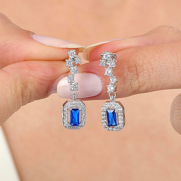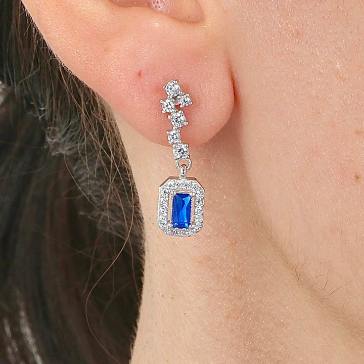 A zig-zag bar of pavé stones ends in a deep sapphire-blue stone framed by a micro-halo, giving neat sparkle without excess weight. Ideal for weddings, office dinners, or whenever you need just a touch of “dressy” in seconds.