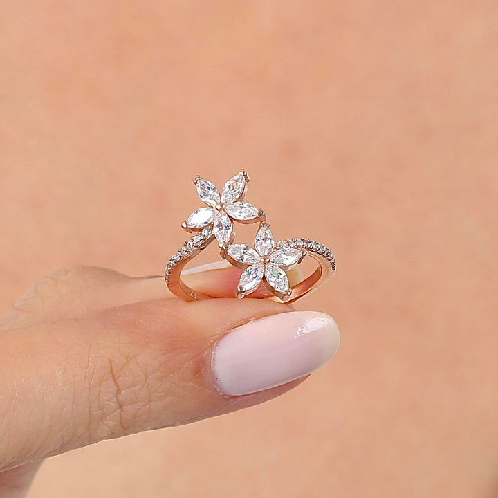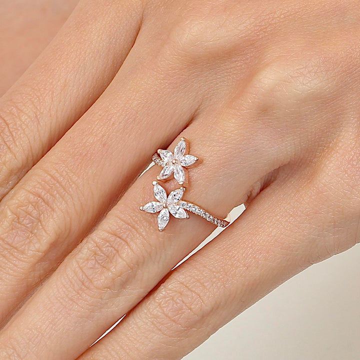 Two crystal-paved star blossoms perch on the open ends of a slim, pavé-lined band, giving the look of a wrap-around mini bouquet. The airy gap makes the ring easy to adjust and perfect for stacking above plain bands. Wear it solo for subtle sparkle or layer it into a mixed-metal stack for extra shine.