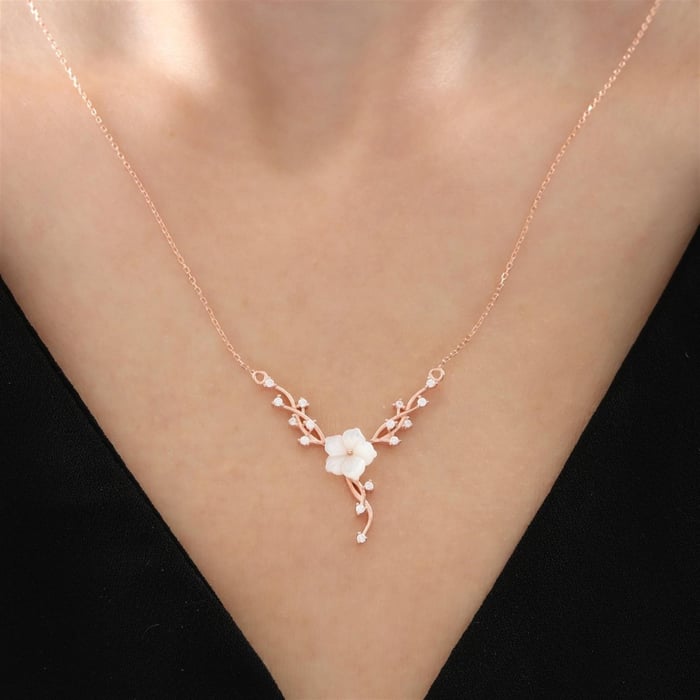 Magnolia and Ivy Flower Necklace In Rose Gold