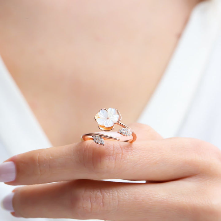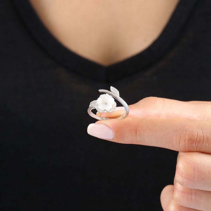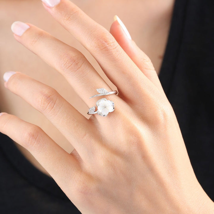 A hand-carved mother-of-pearl magnolia blooms on one end of a gently adjustable wrap band, balanced by two crystal-tipped leaves on the other. The open design hugs the finger like a tiny branch and lets you wear it snug or loose, solo or stacked. An easy way to add floral charm without bulky height.