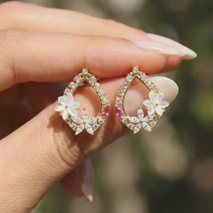 A slim, open teardrop lined with pastel crystals meets a delicate white magnolia bloom at the base, giving an elegant “floating” effect on the lobe. The warm gold tone flatters every skin tone while the compact size keeps them office-friendly. Dress them up with evening silks or let them brighten a simple tee.