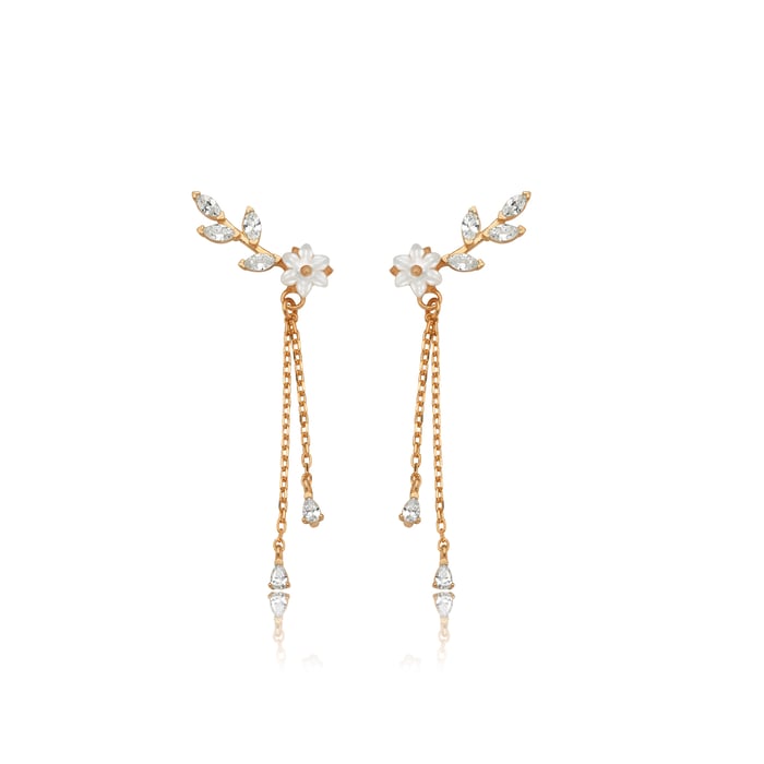 A tiny mother-of-pearl magnolia rests on a crystal leaf vine, with slim chain drops ending in teardrop stones for gentle sway. The rose gold keeps the look fresh and modern—great for office days that roll into dinner plans.