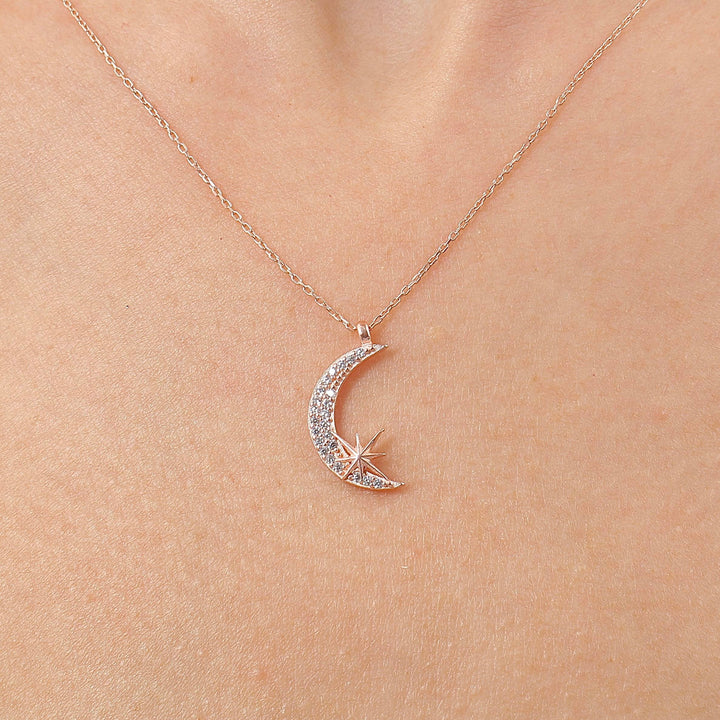 A pavé-set crescent moon meets a tiny open star, giving your neckline a hint of night-sky sparkle. The slim pendant sits just below the collarbone, easy to style with plain tees, shirts, or a little black dress. A sweet everyday piece or a thoughtful gift for stargazers.