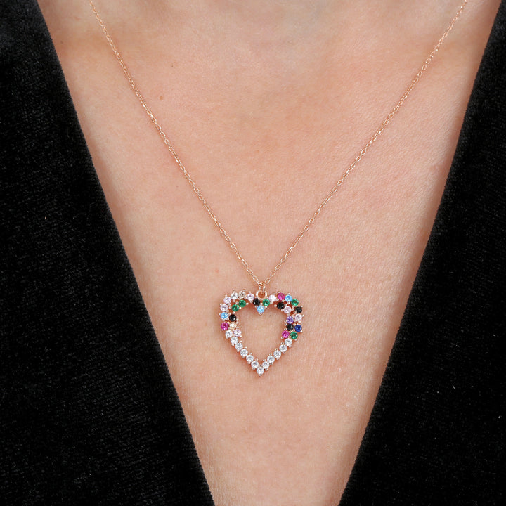 Celebrate love and color with this captivating heart-shaped pendant, crafted from premium 925 sterling silver and finished in a warm gold tone. A symphony of gemstones-clear, green, blue, pink, and purple are meticulously arranged around the heart, creating a dazzling mosaic that catches light from every angle.