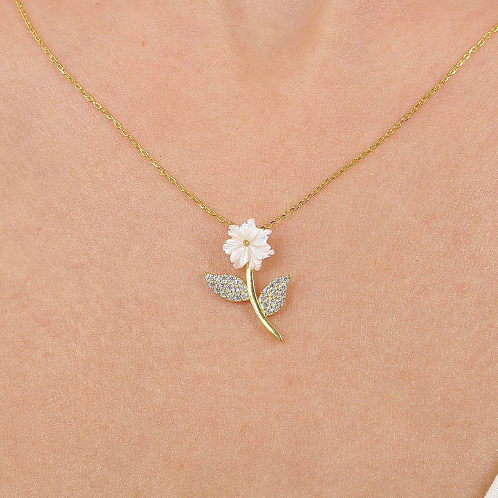 A delicate celebration of nature and femininity, the Petal Whisper Pendant features a sculpted white blossom perched above two graceful leaves studded with sparkling pavé stones. Expertly crafted in 92.5 sterling silver with a gold finish, the pendant hangs from a fine adjustable chain that sits elegantly at the neckline.
