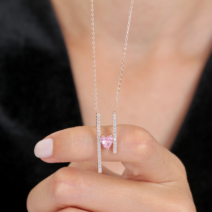 Two sleek pavé bars meet in the centre to cradle a vivid heart-shaped pink-tone stone—creating the perfect balance of modern geometry and romantic sparkle. Hand-forged from hallmarked 925 Sterling Silver and coated with an ultra-thin, nickel-free rhodium layer, the necklace keeps its bright lustre far into the future. Lightweight and effortlessly chic, it transitions from workday minimalism to evening elegance without missing a beat.