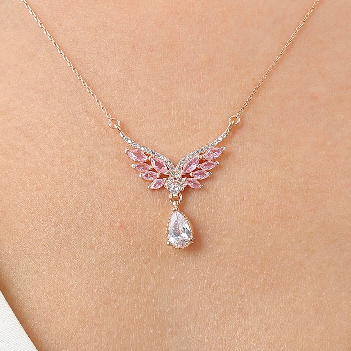 Pink Angel Wing Teardrop Necklace In Rose Gold