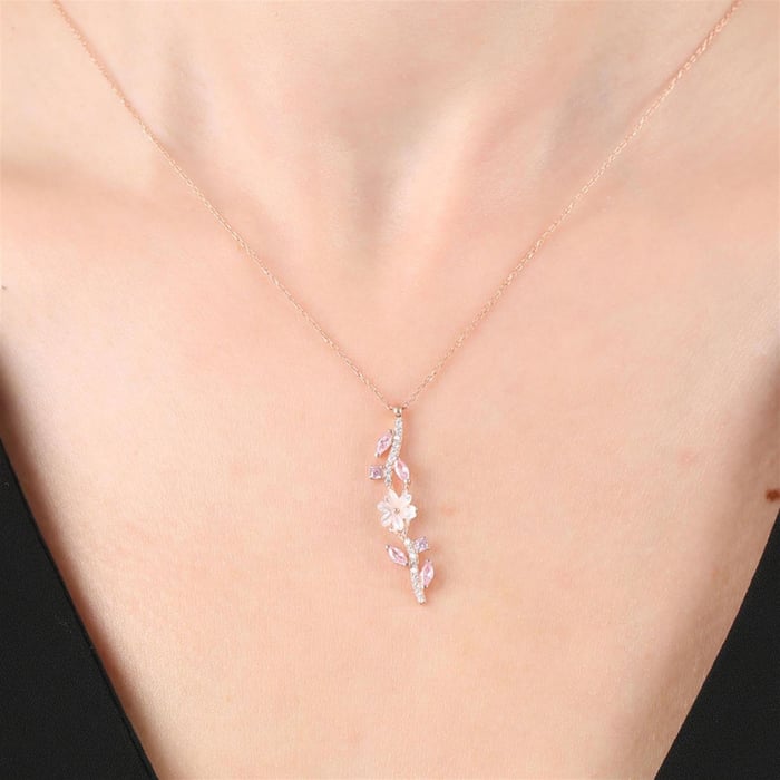 A slim vine drops down the chain, dotted with soft-pink stones and a small carved magnolia in the middle. The pendant sits light on the chest but still adds colour you can notice. Easy to wear with everyday tops and sweet enough for brunch or a small party. The vertical line also flatters V-neck and shirt collars.