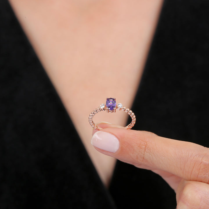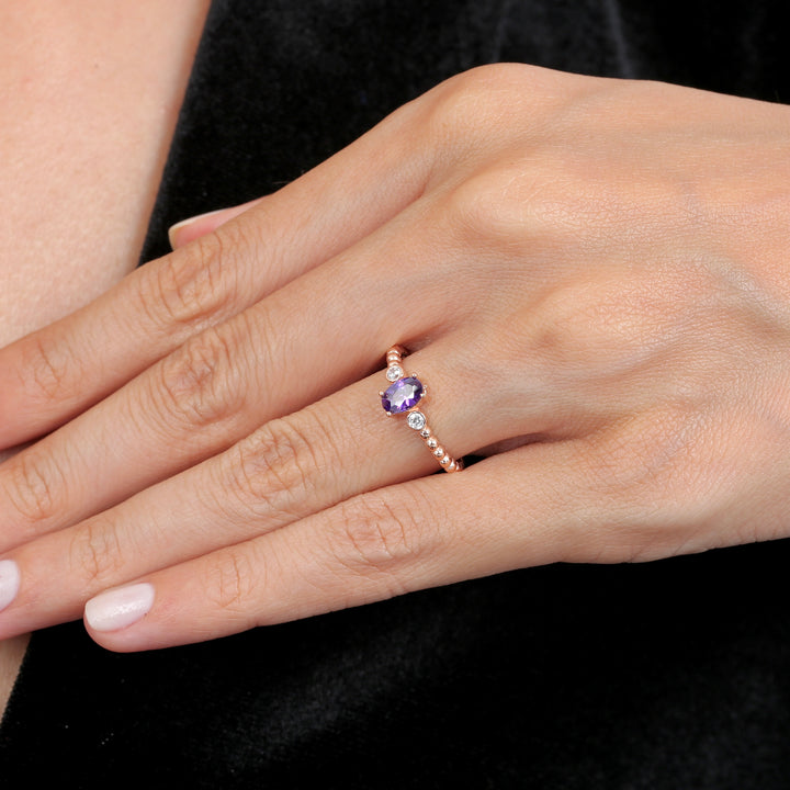 A refined statement of romance and refinement, the Regal Amethyst Halo Ring centers a vivid, heartwarming purple gemstone flanked by two brilliant side stones and a sparkling band. Meticulously pavé-set clear stones trace the band to amplify the center gem’s glow. Crafted in 92.5 sterling silver with a warm gold finish, this ring balances vintage charm with modern wearability, designed to sit comfortably and sparkle with every gesture.