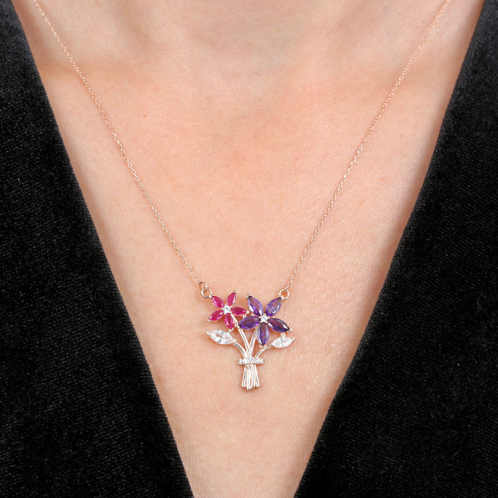 Rose Silver Fuchsia & Amethyst Love Bouquet Necklace