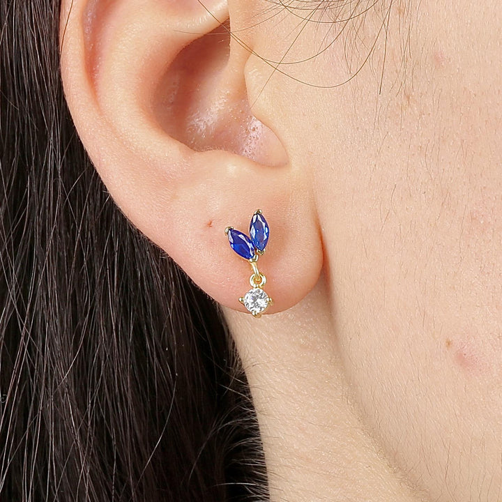Two marquise-cut sapphire-blue stones form a tiny leaf sprig, with a clear round crystal dancing just below the lobe. The hint of colour is bright but not loud, making these studs-with-movement perfect for work shirts and evening dresses alike. Lightweight posts and a warm gold tone keep the look modern and easy to pair with other jewellery.