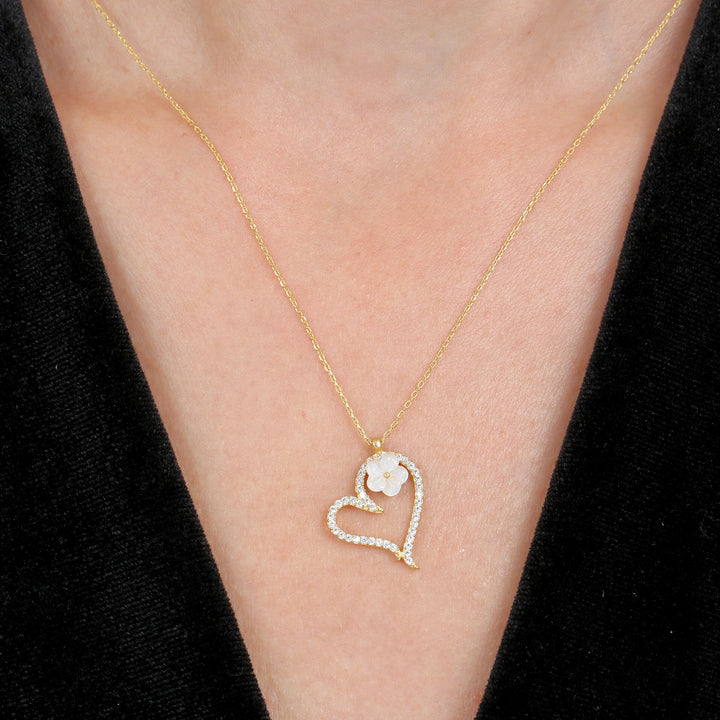 Serene Heart Bloom is a tender keepsake: a gentle heart outline traced in pavé sparkle, crowned by a tiny sculpted flower with a central gem, suspended from a fine rose-gold chain. The design reads like a quiet promise, balanced between youthful charm and refined wearability, made to sit close to the throat and catch light with every movement.