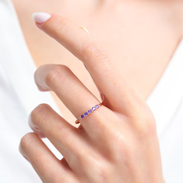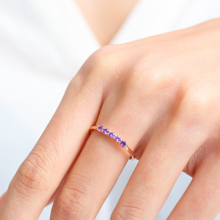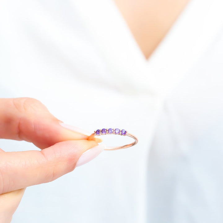 Five petite purple stones sit in a neat row across an ultra-slim band, giving clean, contemporary sparkle that’s made for stacking. Wear it solo for a whisper of colour or line it up with midi and signet rings for an effortless gradient stack.